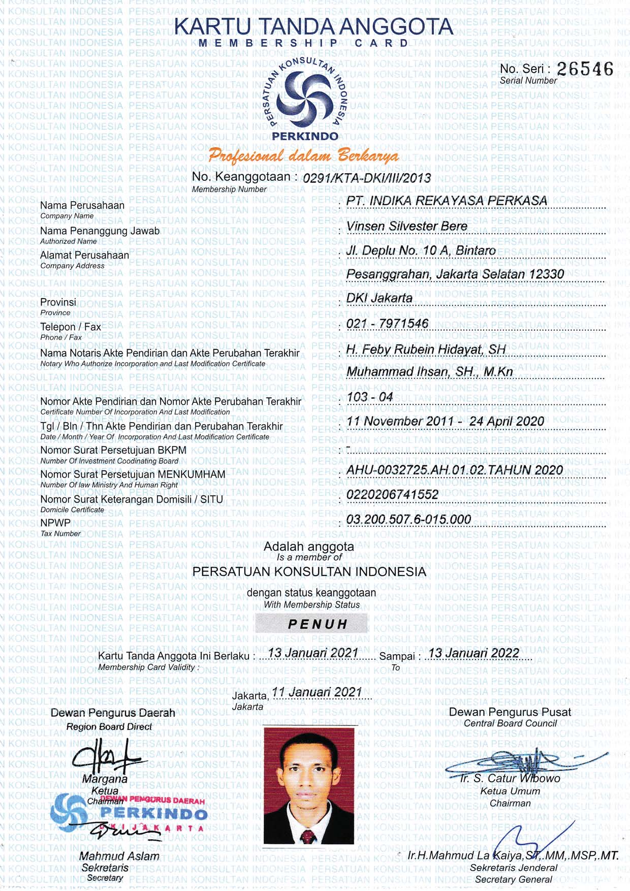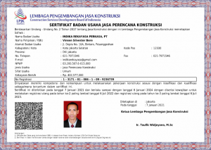 Jasa Konsultan Konstruksi : PT. INDIKA REKAYASA PERKASA adalah badan usaha berpengalaman yang mengerjakan proyek nasional. PT. INDIKA REKAYASA PERKASA saat ini memiliki kualifikasi . PT. INDIKA REKAYASA PERKASA dapat mengerjakan proyek-proyek dengan sub klasifikasi: AR102 Jasa Desain Arsitektural AR103 Jasa Penilai Perawatan dan Kelayakan Bangunan Gedung AR105 Jasa Arsitektur lainnya RE201 Jasa Pengawas Pekerjaan Konstruksi Bangunan Gedung RE202 Jasa Pengawas Pekerjaan Konstruksi Teknik Sipil Transportasi RE203 Jasa Pengawas Pekerjaan Konstruksi Teknik Sipil Air.